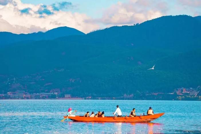 14:00 抵达【里格半岛】,突入湖心的马蹄形半岛将湖水染成孔雀蓝,猪槽船正划破水面驶向里务比岛。建议跳上最鲜艳的那艘小船:当船夫用摩梭语唱起情歌时,把手伸进湖面触碰正在盛开的海菜花——水温永远停留在18℃的温柔。