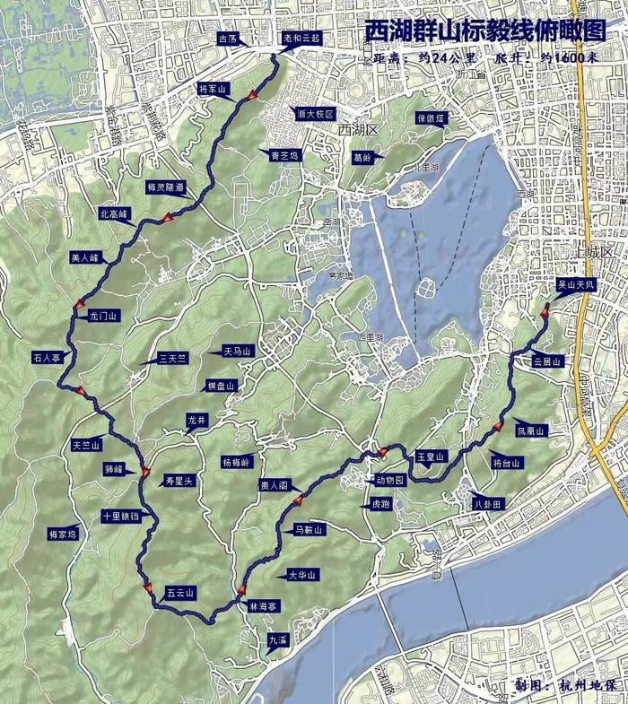 西湖群山标毅路线是杭城非常经典的徒步线路,其连接了西湖周边20余座山丘,距离25公里左右,爬升约为1200。起点位于浙江大学玉泉校区,由此出发上山远眺西湖,登美人峰,经十里琅珰,过五云山、林海亭后,上玉皇山,最终以吴山大观为终点。
